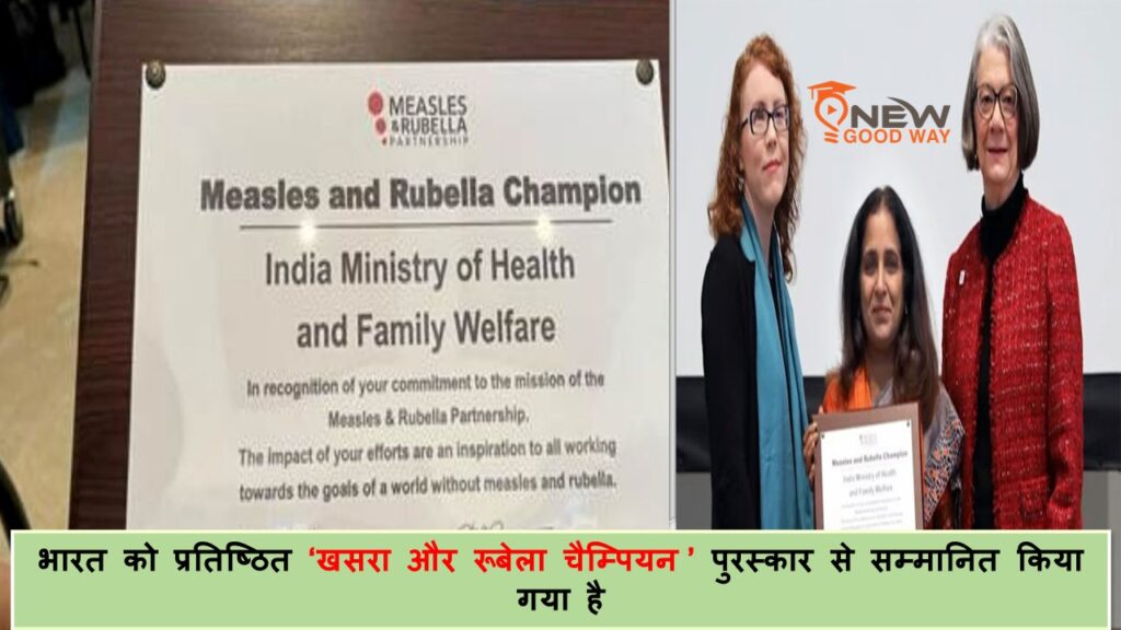 खसरा और रूबेला चैम्पियन’ पुरस्कार से भारत को सम्मानित किया गया है। क्योंकी भारत को यह पुरस्कार इन बीमारियों से निपटने में इसके अनुकरणीय प्रयास के लिए दिया गया है। वाशिंगटन डीसी स्थित अमेरिकी रेड क्रॉस मुख्यालय में ‘द मीजल्स एंड रूबेला पार्टनरशिप’ की ओर से भारत को सम्मानित किया गया। खसरा और रूबेला टीकाकरण के माध्यम से रोकी जा सकने वाली बीमारियां हैं। एमआर वैक्सीन वर्ष 2017 से देश के सार्वजनिक टीकाकरण कार्यक्रम का हिस्सा है। यह पुरस्कार वाशिंगटन में अमरीकी रेडक्रॉस मुख्यालय में स्वास्थ्य और परिवार कल्याण मंत्रालय की ओर से राजदूत श्रीप्रिया रंगनाथन ने प्राप्त किया।