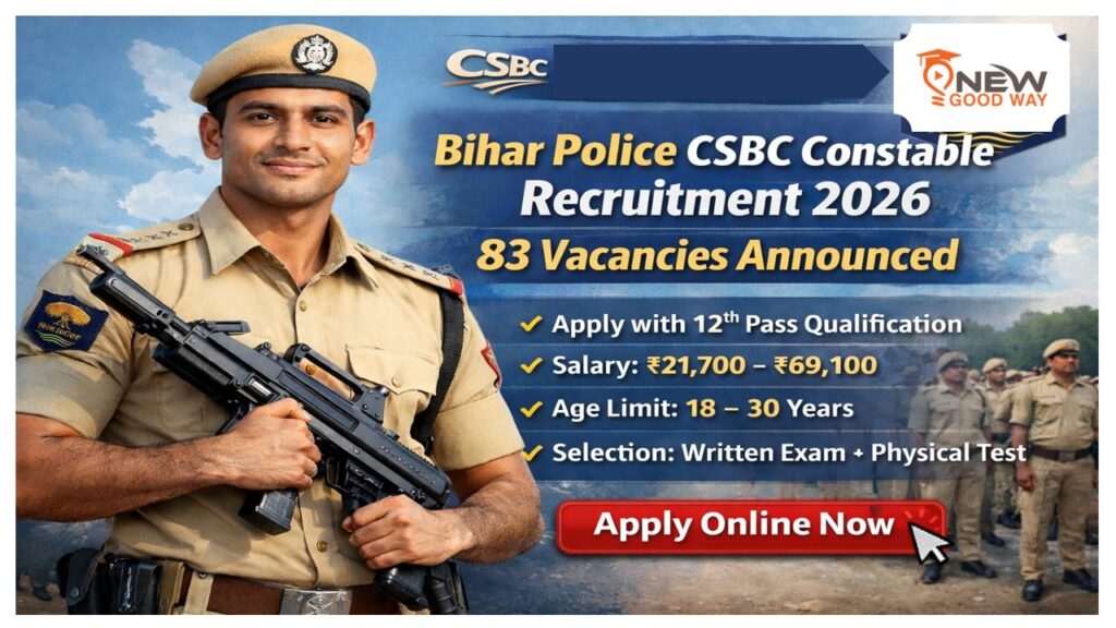 Central Selection Board of Constables ने Bihar Police CSBC Constable Recruitment 2026 के तहत कॉन्स्टेबल पदों पर भर्ती के लिए आधिकारिक नोटिफिकेशन जारी किया है। इस भर्ती के माध्यम से कुल 83 पदों को भरा जाएगा। इस भर्ती में आवेदन करने के लिए उम्मीदवार का किसी मान्यता प्राप्त बोर्ड से 12वीं पास होना आवश्यक है। इच्छुक और योग्य उम्मीदवार ऑनलाइन माध्यम से आवेदन कर सकते हैं।