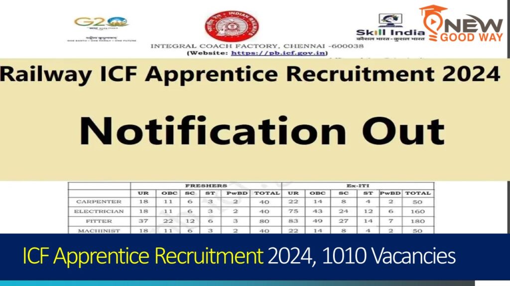 ICF Apprentice Recruitment 2024, 1010 Vacancies जारी किए हैं। वे उम्मीदवार जो इस रेलवे ICF अपरेंटिस भर्ती में रुचि रखते हैं, वे 22 मई 2024 से 21 जून 2024 तक ऑनलाइन आवेदन कर सकते हैं। भर्ती पात्रता, पद की जानकारी, चयन प्रक्रिया, ट्रेड विवरण, आयु सीमा, वेतनमान और अन्य सभी जानकारी के लिए पढ़ें।