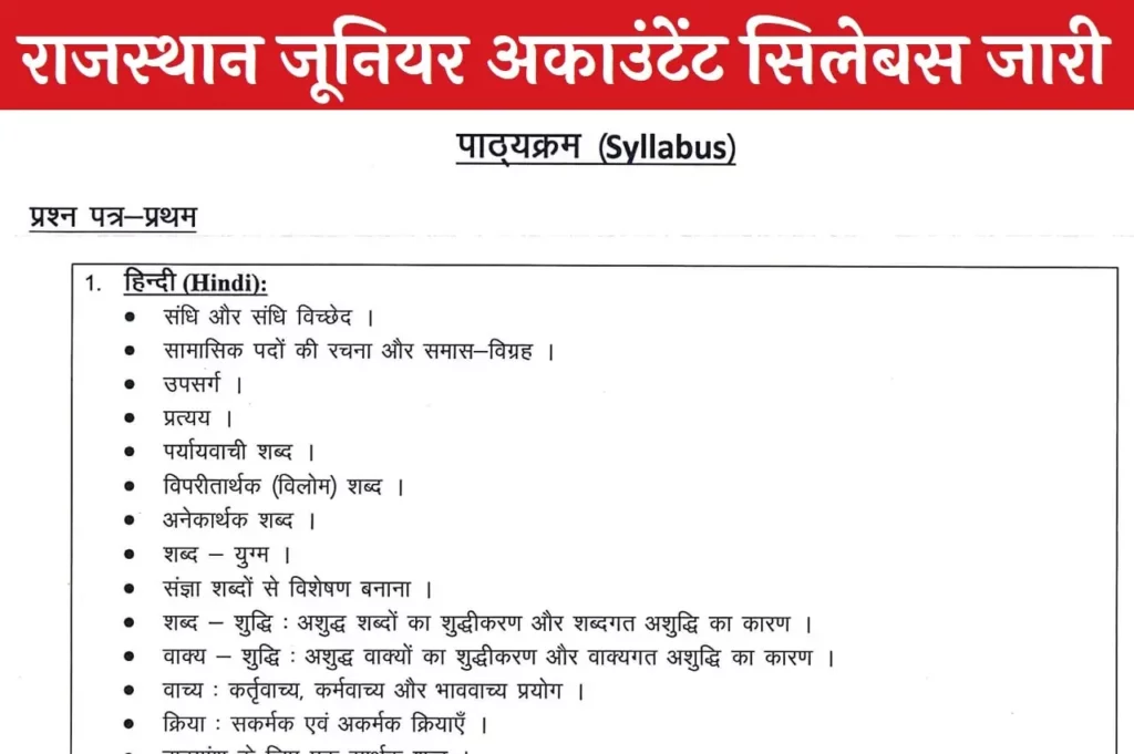 Rajasthan Junior Accountant Syllabus 2023 और एग्जाम पैटर्न आज 20 जून 2023 को जारी कर दिया है। अभ्यर्थी राजस्थान कर्मचारी चयन बोर्ड की ऑफिशल वेबसाइट से चेक कर सकते हैं।